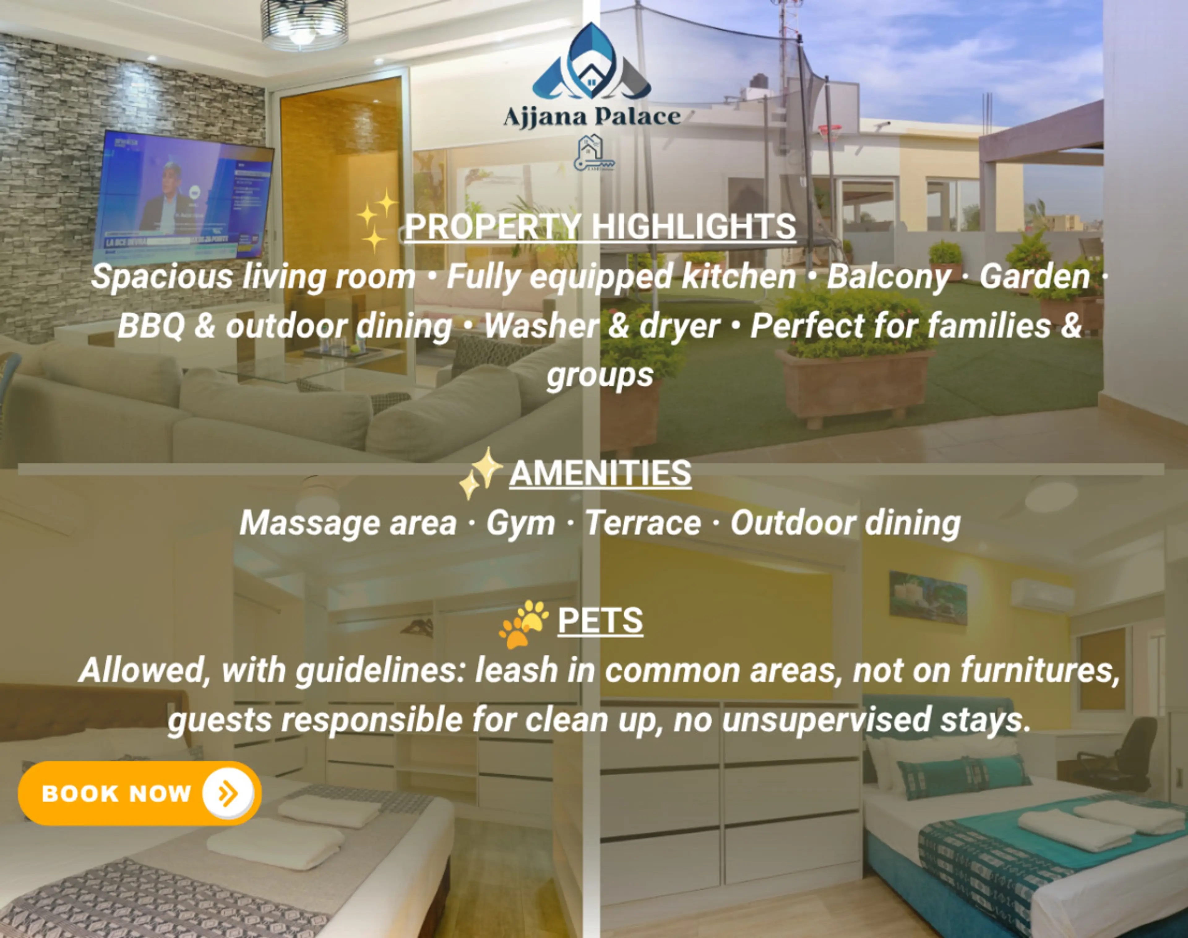 Stay in Ajjana Palace, where luxury meets comfort. This stylish 2-bedroom, 2-bathroom features a fully-equipped kitchen, elegant dining and living areas, and inviting outdoor spaces. Perfect for families, friends, or colleagues, it offers a spacious, serene, and luxurious home away from home — the i...